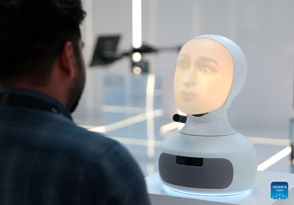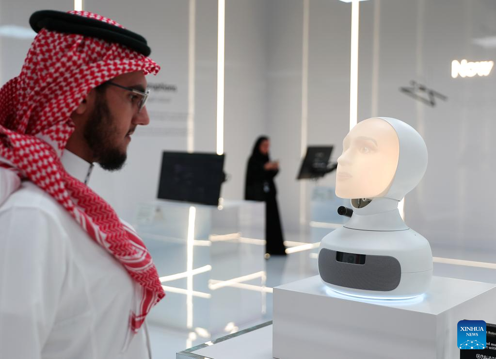 Visitors communicates with a "conversational robot" during the third edition of the Global AI Summit (GAIN) in Riyadh, Saudi Arabia, Sept. 12, 2024. (Xinhua/Wang Dongzhen)
