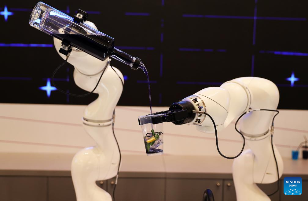 Robotic arms make beverages during the third edition of the Global AI Summit (GAIN) in Riyadh, Saudi Arabia, Sept. 10, 2024. (Xinhua/Wang Dongzhen)