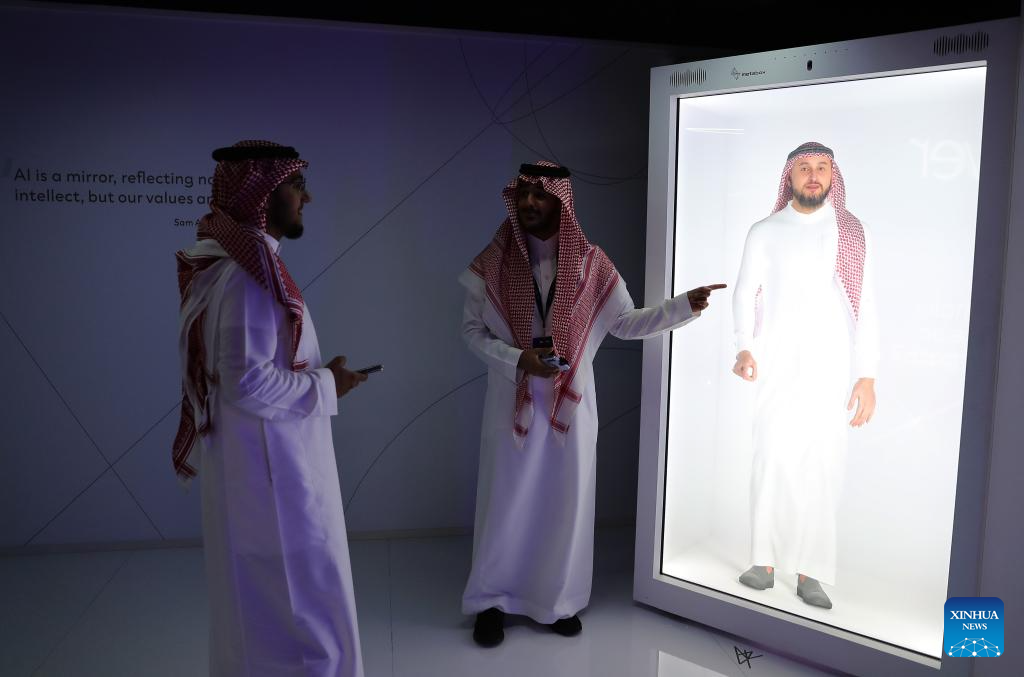 Visitors experience AI conversation during the third edition of the Global AI Summit (GAIN) in Riyadh, Saudi Arabia, Sept. 12, 2024. (Xinhua/Wang Dongzhen)