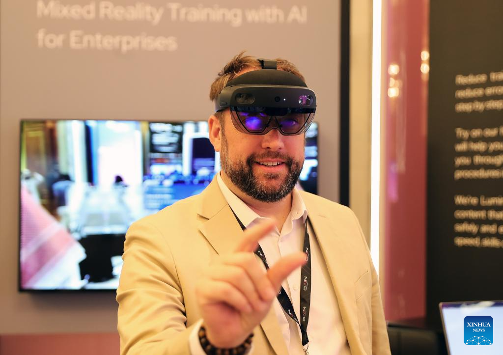 A staff member controls AI glasses of mixed reality training with AI for enterprises during the third edition of the Global AI Summit (GAIN) in Riyadh, Saudi Arabia, Sept. 10, 2024. (Xinhua/Wang Dongzhen)