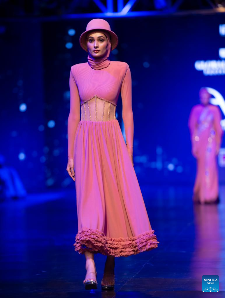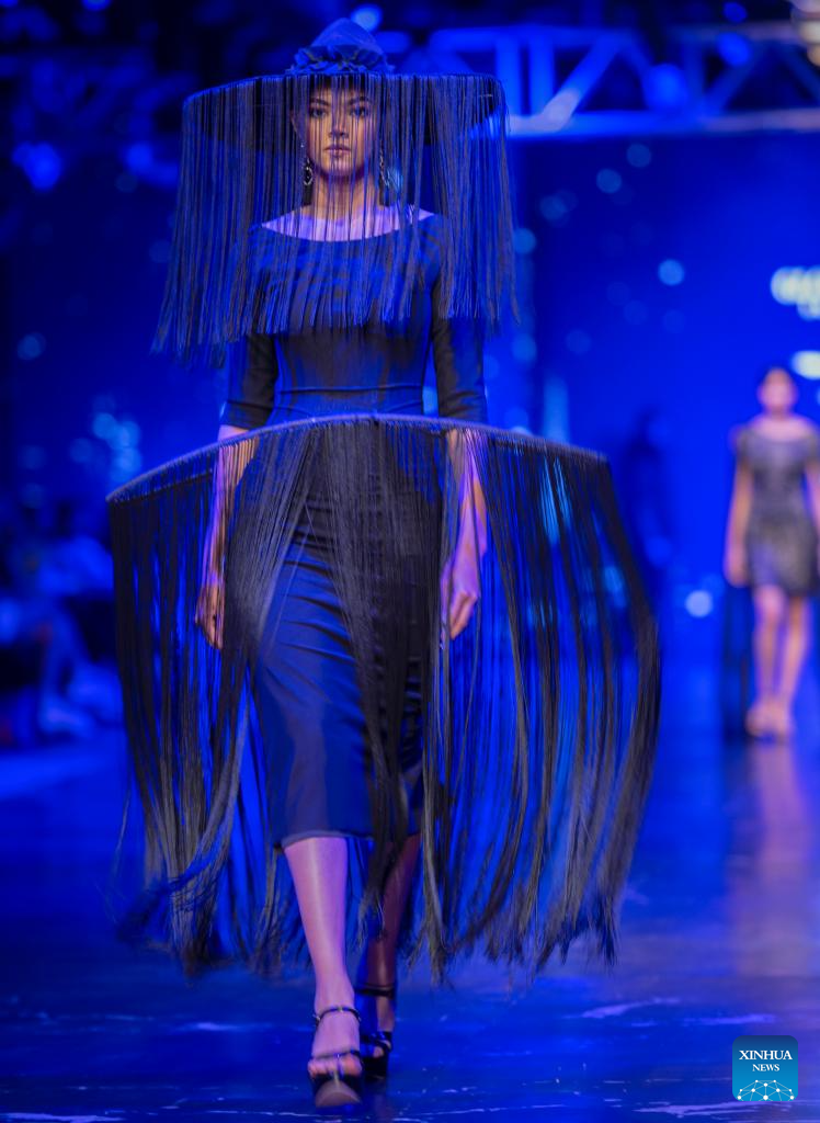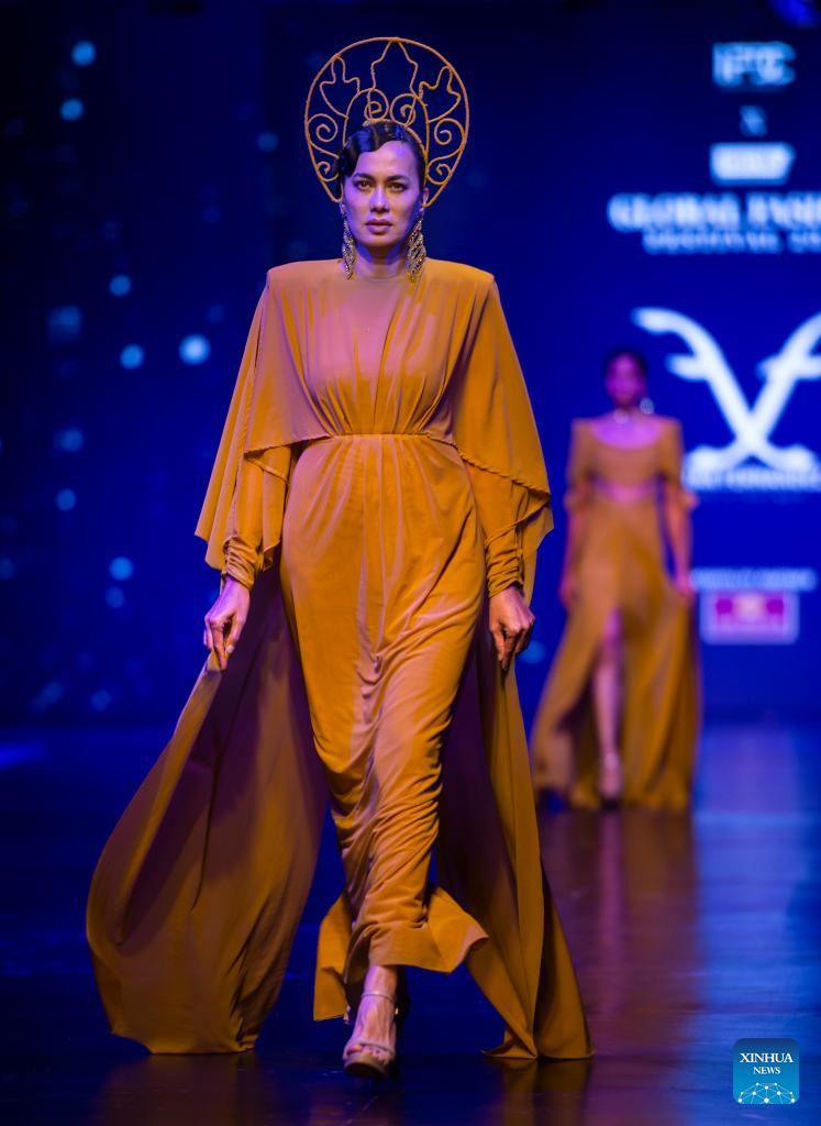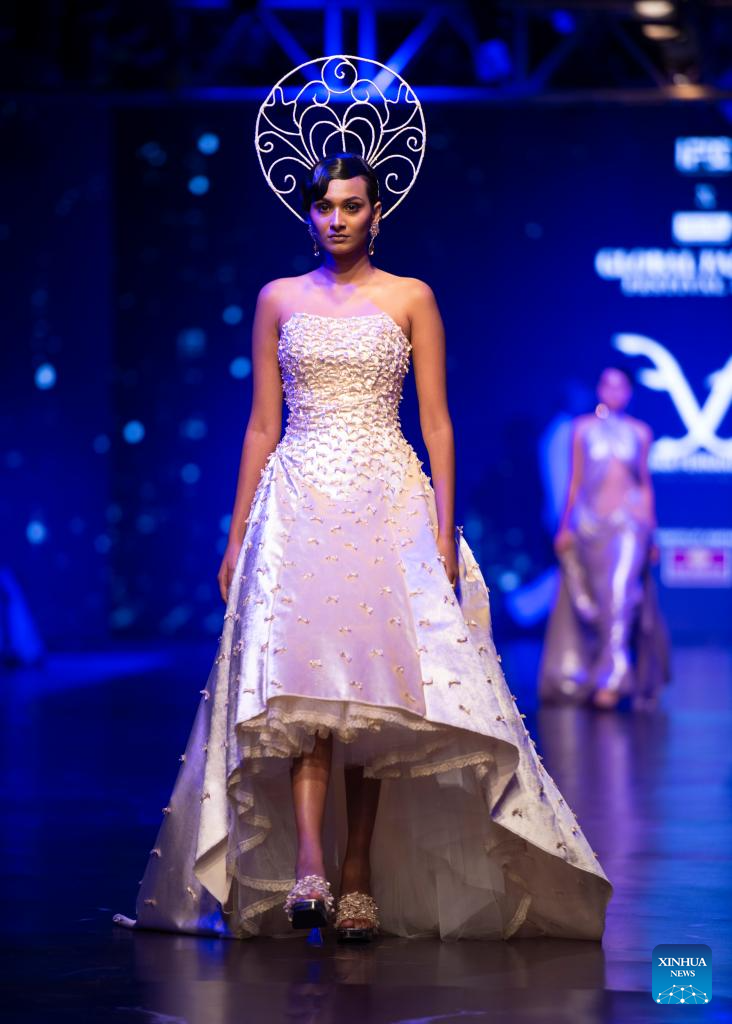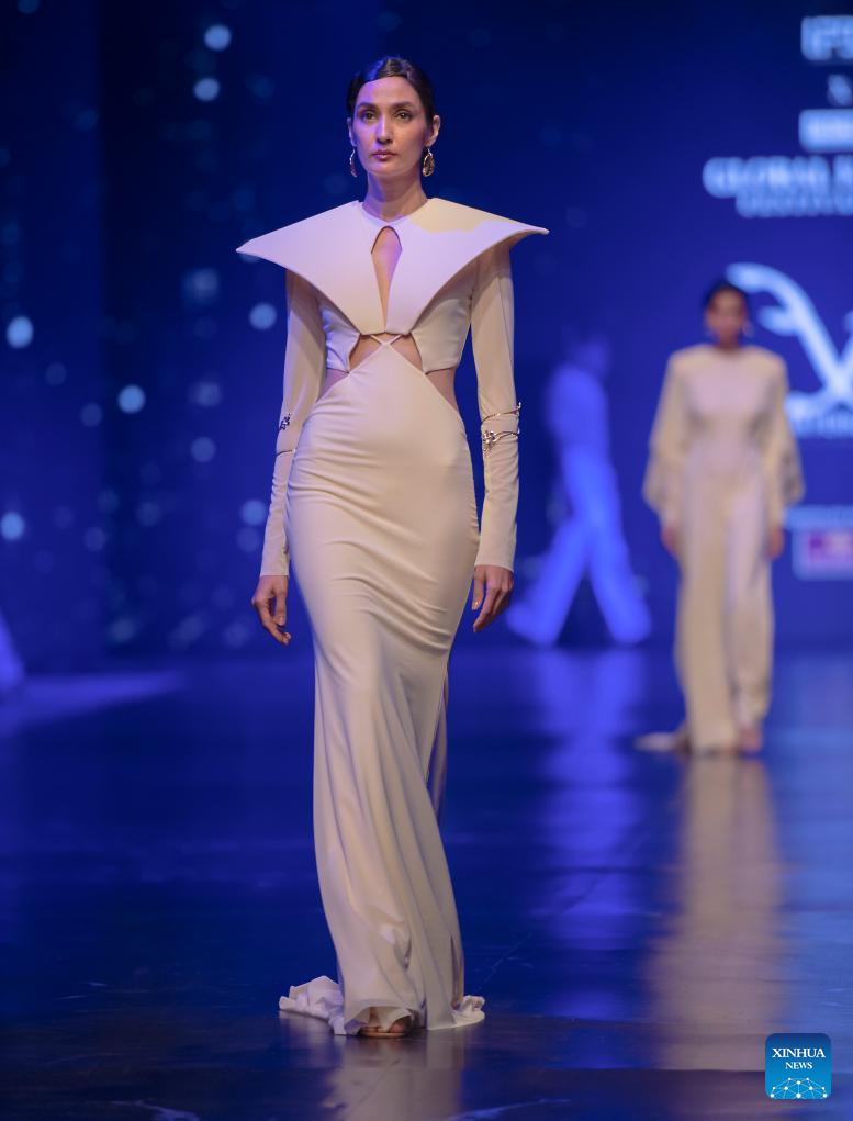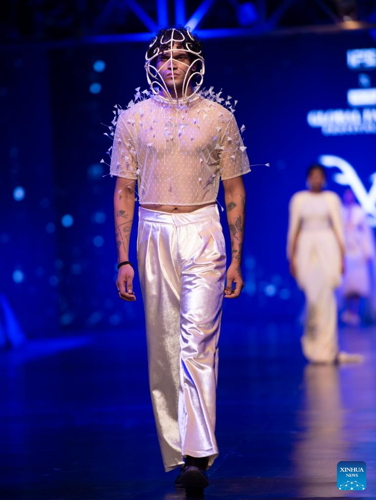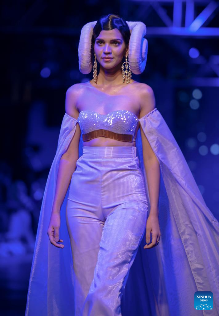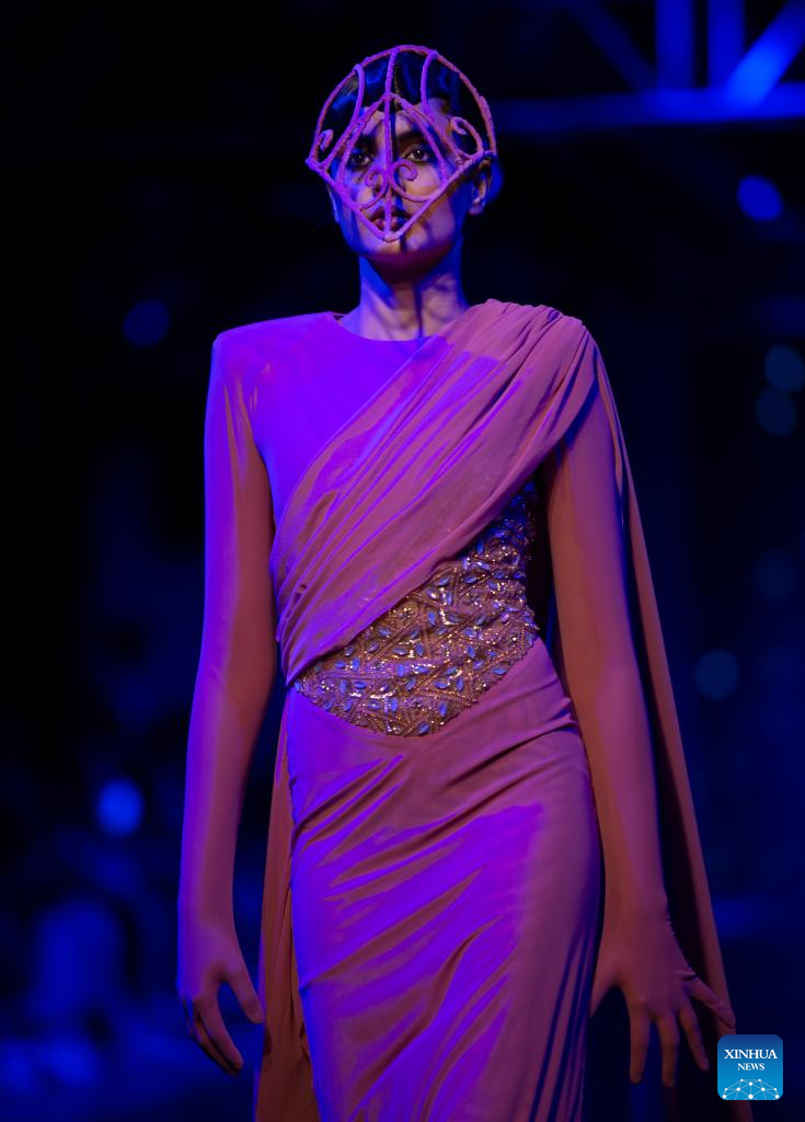 A model presents a creation by designer Rian Fernandez during the Global Fashion Week 2024 at Gurugram on the outskirts of New Delhi, India, on Sept. 12, 2024. (Xinhua/Javed Dar)