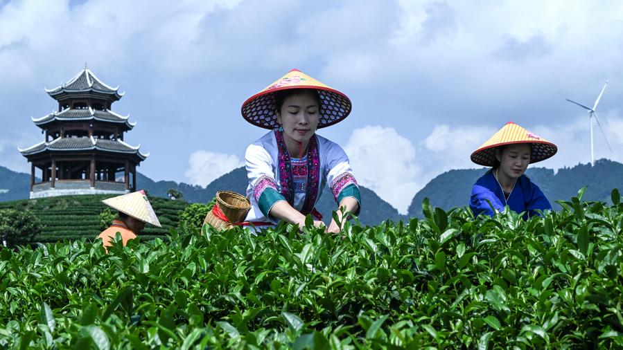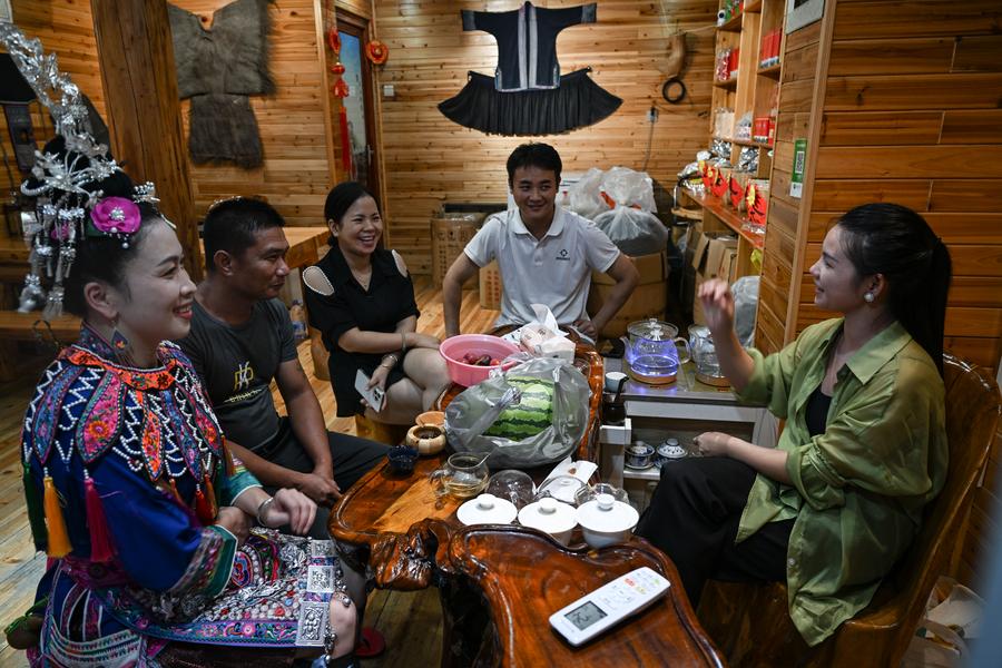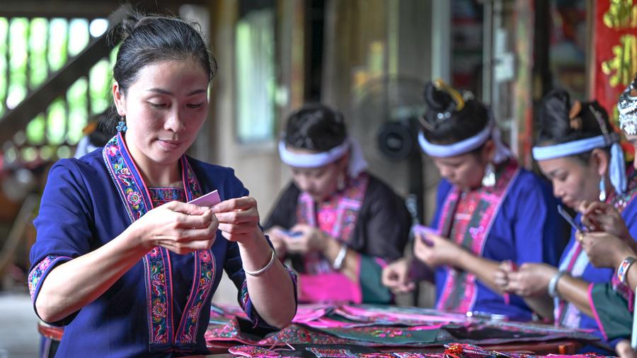 Wu Chunyue (1st L, front) learns Dong embroidery making in Sanjiang Dong Autonomous County, south China's Guangxi Zhuang Autonomous Region, Aug. 30, 2024. (Xinhua/Zhang Ailin)Wu Chunyue (C, front) and local people perform Grand Song of the Dong ethnic group to welcome tourists before a banquet in Chengyang Eight Villages in Sanjiang Dong Autonomous County, south China's Guangxi Zhuang Autonomous Region, Aug. 28, 2024. (Xinhua/Zhang Ailin)Wu Chunyue (C) teaches tourists to sing a toast song of the Dong ethnic group during a banquet in Chengyang Eight Villages in Sanjiang Dong Autonomous County, south China's Guangxi Zhuang Autonomous Region, Aug. 28, 2024. (Xinhua/Zhang Ailin)Local people and tourists make toasts during a banquet in Chengyang Eight Villages in Sanjiang Dong Autonomous County, south China's Guangxi Zhuang Autonomous Region, Aug. 28, 2024. (Xinhua/Zhang Ailin)Wu Chunyue airs rice in Sanjiang Dong Autonomous County, south China's Guangxi Zhuang Autonomous Region, Aug. 29, 2024. (Xinhua/Zhang Ailin)Wu Chunyue (1st L, front) talks with tourists at a teahouse in Chengyang Eight Villages in Sanjiang Dong Autonomous County, south China's Guangxi Zhuang Autonomous Region, Aug. 28, 2024. (Xinhua/Zhang Ailin)People of the Dong ethnic group prepare a banquet for tourists in Chengyang Eight Villages in Sanjiang Dong Autonomous County, south China's Guangxi Zhuang Autonomous Region, Aug. 28, 2024. (Xinhua/Zhang Ailin)Wu Chunyue (1st R, front) prepares a banquet for tourists in Chengyang Eight Villages in Sanjiang Dong Autonomous County, south China's Guangxi Zhuang Autonomous Region, Aug. 28, 2024. (Xinhua/Zhang Ailin)Wu Chunyue (C) picks tea leaves at a tea garden in Sanjiang Dong Autonomous County, south China's Guangxi Zhuang Autonomous Region, Aug. 31, 2024. (Xinhua/Zhang Ailin)Wu Chunyue (C) and local people sing songs to welcome tourists before a banquet in Chengyang Eight Villages in Sanjiang Dong Autonomous County, south China's Guangxi Zhuang Autonomous Region, Aug. 28, 2024. (Xinhua/Zhang Ailin)An aerial drone photo taken on Aug. 30, 2024 shows a view of Chengyang Eight Villages in Sanjiang Dong Autonomous County, south China's Guangxi Zhuang Autonomous Region. (Xinhua/Zhang Ailin)