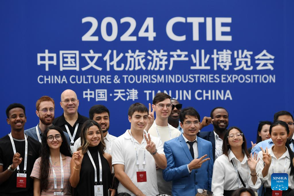 Guests pose for photos during the 2024 China Culture and Tourism Industries Exposition in north China's Tianjin, Sept. 13, 2024. The four-day exposition opened here on Friday. Over 2,000 cultural and tourism enterprises are participating, with immersive experience spaces showcasing smart tourism and outdoor equipment, achievements in deep integration of culture and tourism, as well as development in innovative cultural products and services. (Xinhua/Zhao Zishuo)