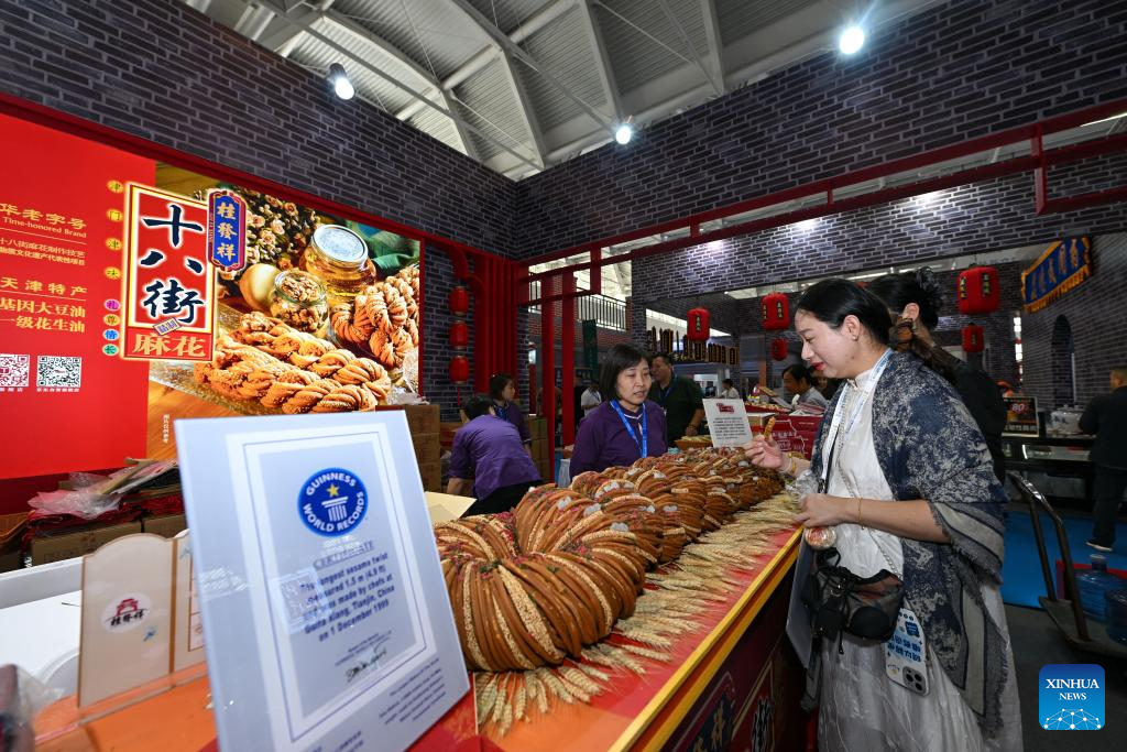 A visitor tastes a large sesame twist during the 2024 China Culture and Tourism Industries Exposition in north China's Tianjin, Sept. 13, 2024. The four-day exposition opened here on Friday. Over 2,000 cultural and tourism enterprises are participating, with immersive experience spaces showcasing smart tourism and outdoor equipment, achievements in deep integration of culture and tourism, as well as development in innovative cultural products and services. (Xinhua/Sun Fanyue)