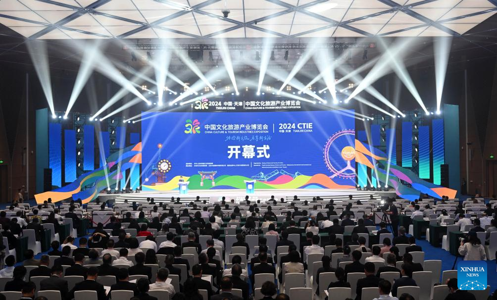 The opening ceremony of the 2024 China Culture and Tourism Industries Exposition is held in north China's Tianjin, Sept. 13, 2024. The four-day exposition opened here on Friday. Over 2,000 cultural and tourism enterprises are participating, with immersive experience spaces showcasing smart tourism and outdoor equipment, achievements in deep integration of culture and tourism, as well as development in innovative cultural products and services. (Xinhua/Zhao Zishuo)