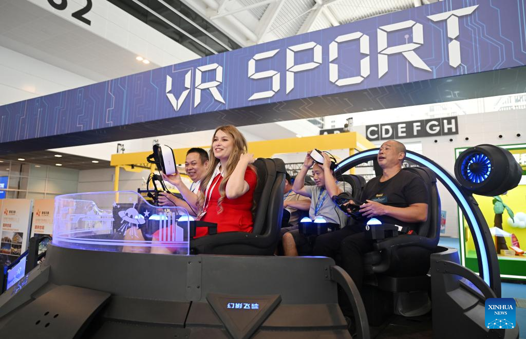 People try VR devices during the 2024 China Culture and Tourism Industries Exposition in north China's Tianjin, Sept. 13, 2024. The four-day exposition opened here on Friday. Over 2,000 cultural and tourism enterprises are participating, with immersive experience spaces showcasing smart tourism and outdoor equipment, achievements in deep integration of culture and tourism, as well as development in innovative cultural products and services. (Xinhua/Zhao Zishuo)