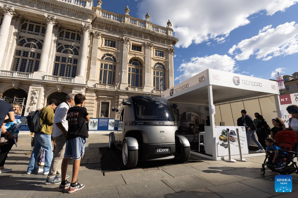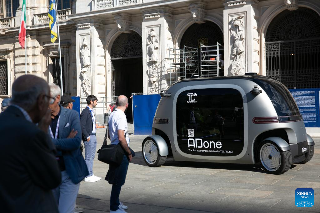 TURIN, Sept. 14 (Xinhua) -- An autopilot minibus named "ADone" stole the spotlight at the ongoing 2024 Turin Auto Show, drawing attention with its design and seamless integration of cutting-edge technology.