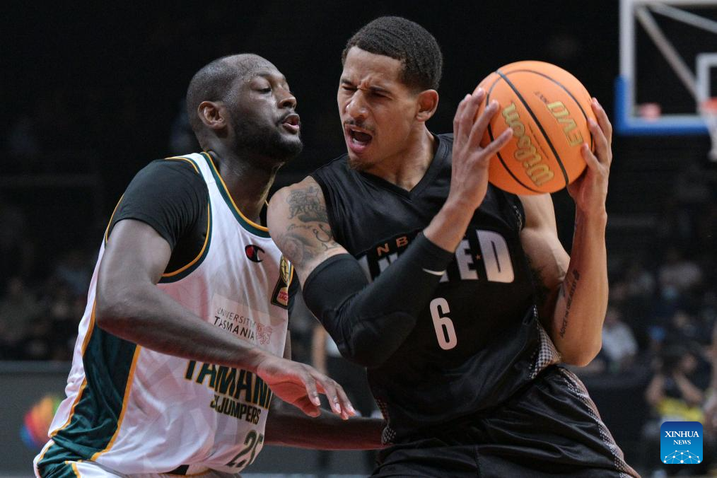 Juan Toscano (R) of NBA G League United competes during the group B match between NBA G League United of the United States and Tasmania JackJumpers of Australia at the FIBA Intercontinental Cup Singapore 2024 in Singapore, Sept. 14, 2024. (Photo by Then Chih Wey/Xinhua)