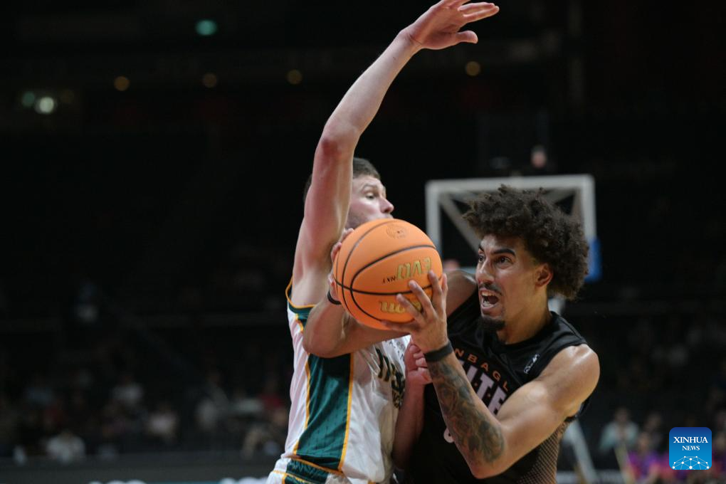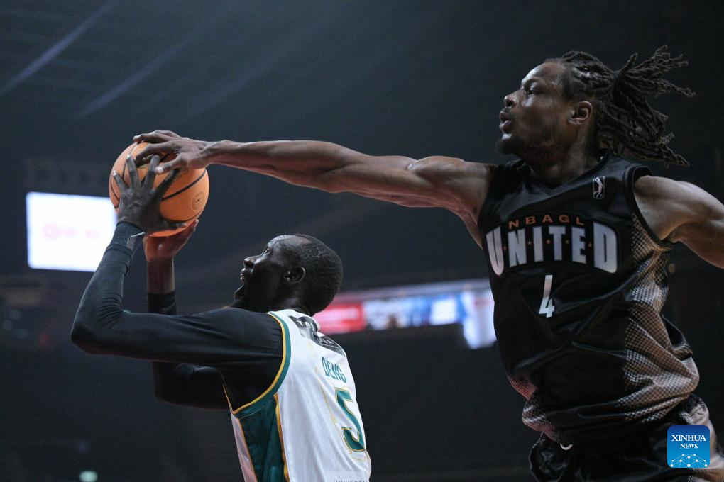 Deonte Burton (R) of NBA G League United defends Majok Deng of Tasmania JackJumpers during the group B match between NBA G League United of the United States and Tasmania JackJumpers of Australia at the FIBA Intercontinental Cup Singapore 2024 in Singapore, Sept. 14, 2024. (Photo by Then Chih Wey/Xinhua)