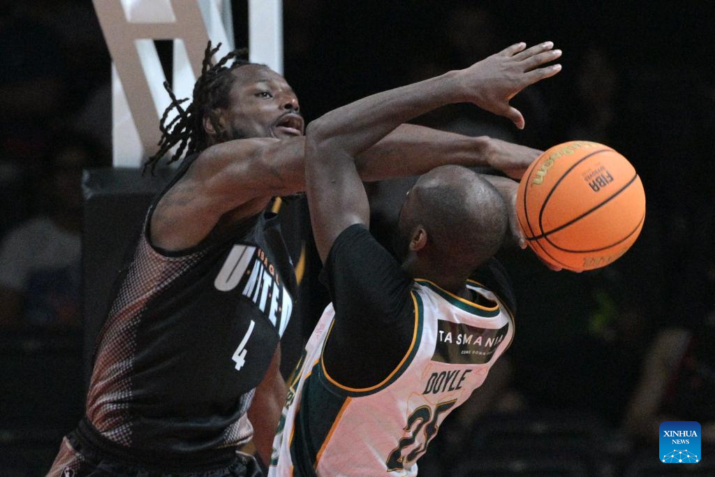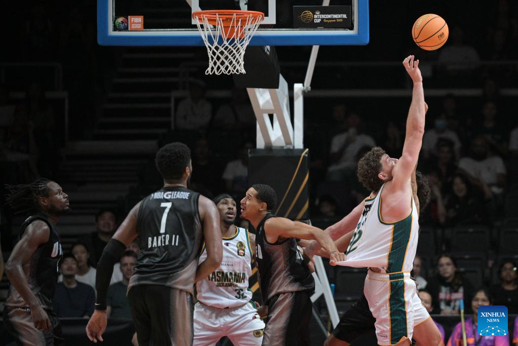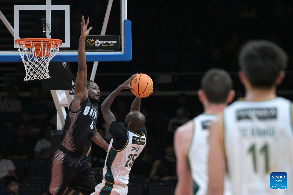Brodric Thomas (R) of NBA G League United competes during the group B match between NBA G League United of the United States and Tasmania JackJumpers of Australia at the FIBA Intercontinental Cup Singapore 2024 in Singapore, Sept. 14, 2024. (Photo by Then Chih Wey/Xinhua)