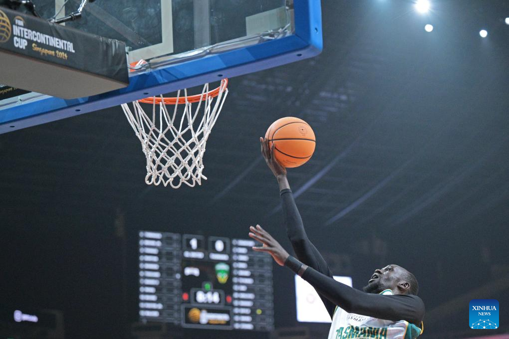 Majok Deng (top) of Tasmania JackJumpers dunks during the group B match between NBA G League United of the United States and Tasmania JackJumpers of Australia at the FIBA Intercontinental Cup Singapore 2024 in Singapore, Sept. 14, 2024. (Photo by Then Chih Wey/Xinhua)