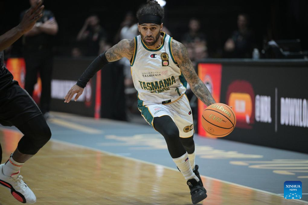 Jordon Crawford of Tasmania JackJumpers drives the ball during the group B match between NBA G League United of the United States and Tasmania JackJumpers of Australia at the FIBA Intercontinental Cup Singapore 2024 in Singapore, Sept. 14, 2024. (Photo by Then Chih Wey/Xinhua)