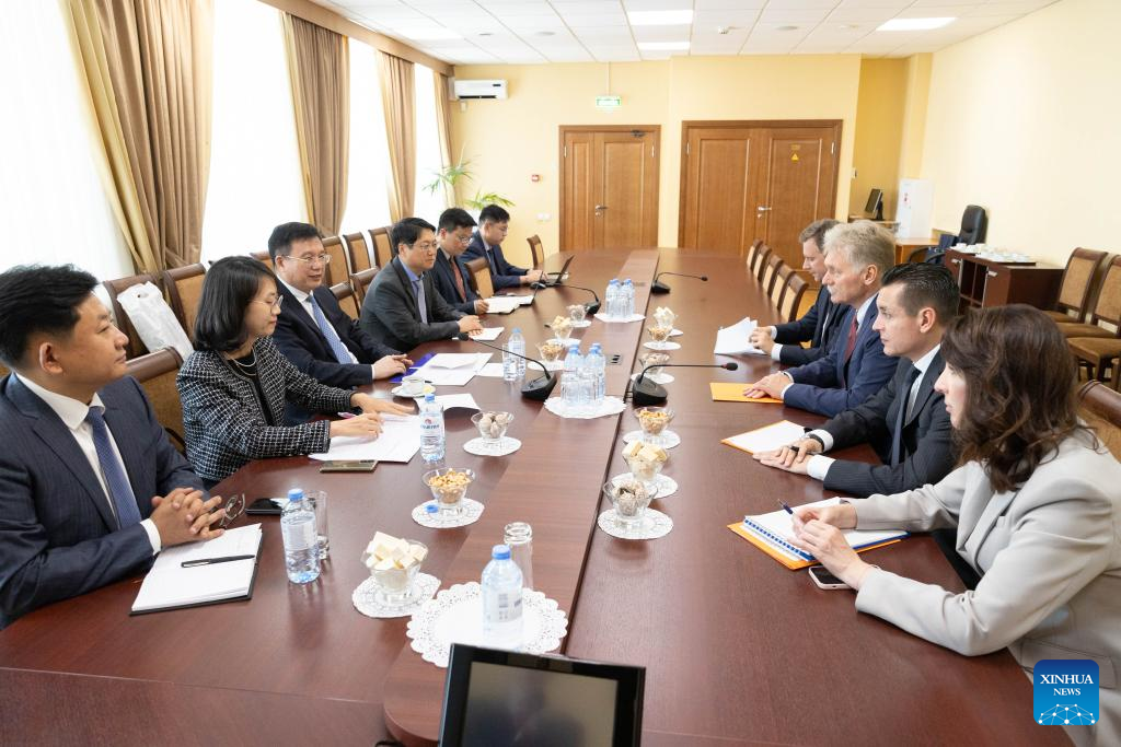 President of Xinhua News Agency Fu Hua meets with Russian Presidential Press Secretary Dmitry Peskov in Moscow, Russia, Sept. 13, 2024. (Xinhua/Bai Xueqi)