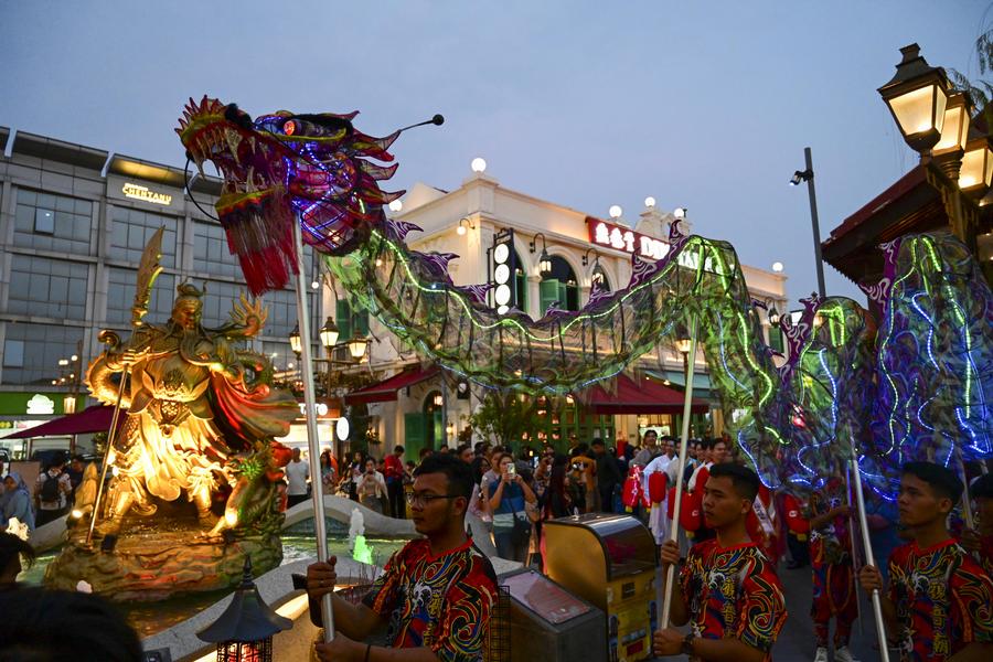 A dragon dance covered in light perform during Mid-Autumn Festival in Pantjoran Chinatown PIK in Jakarta, Indonesia, Sept. 14, 2024. (Xinhua/Zulkarnain)