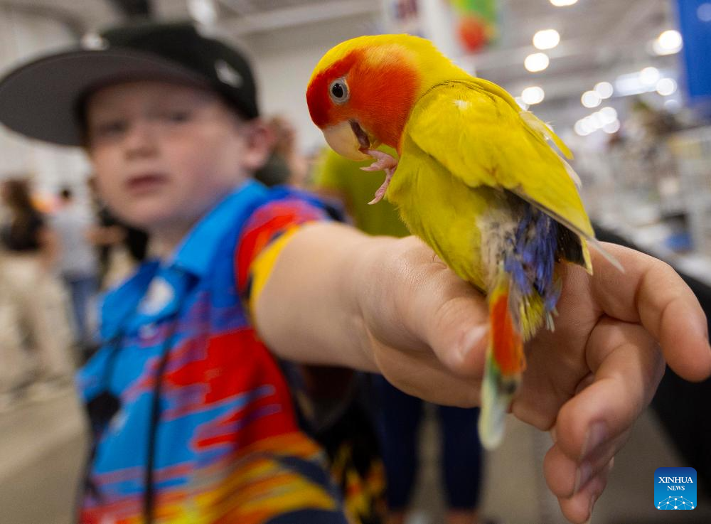 A boy shows a pet parrot during the 2024 Canadian Pet Expo in Mississauga, Ontario, Canada, on Sept. 14, 2024. The annual two-day event kicked off here on Saturday. (Photo by Zou Zheng/Xinhua)