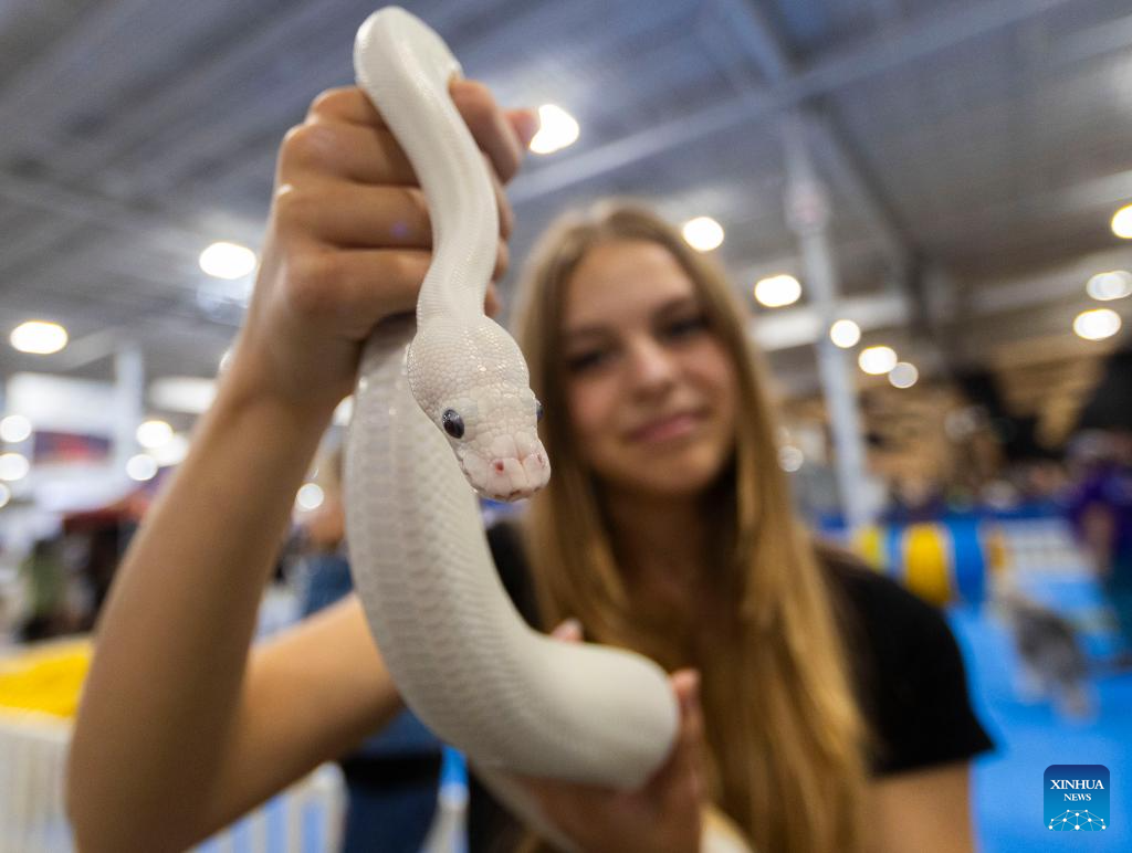 A woman shows her pet snake during the 2024 Canadian Pet Expo in Mississauga, Ontario, Canada, on Sept. 14, 2024. The annual two-day event kicked off here on Saturday. (Photo by Zou Zheng/Xinhua)