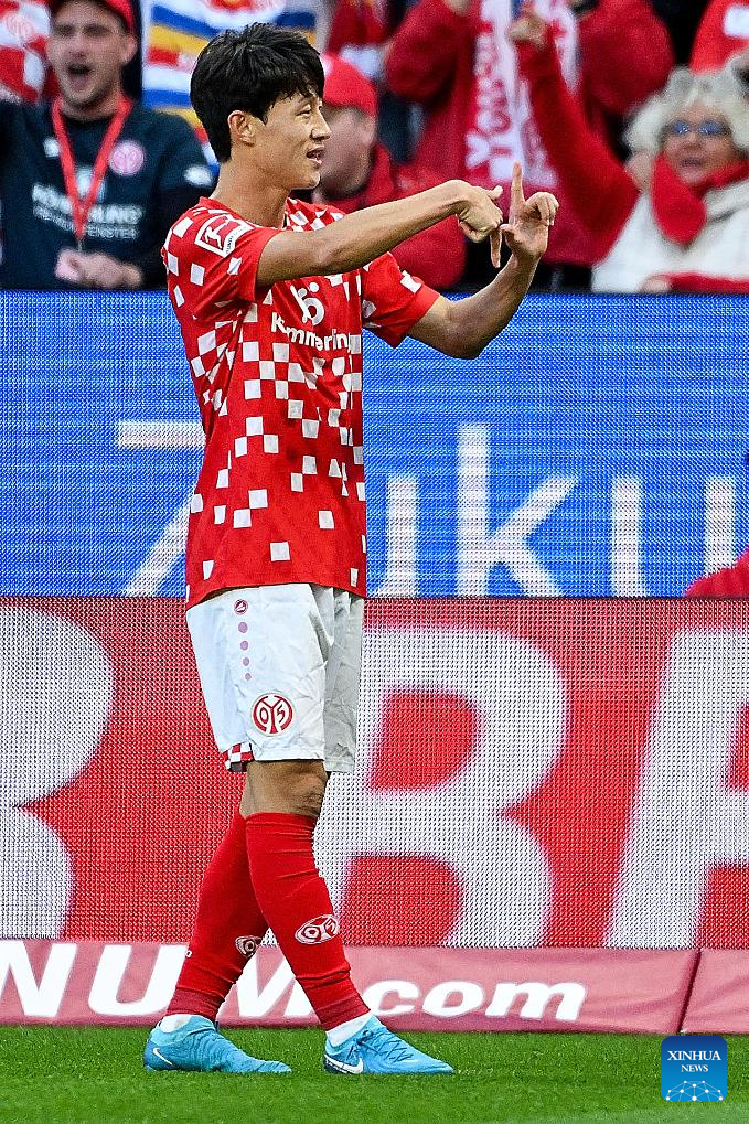 Lee Jae Sung of Mainz 05 celebrates scoring during the first division of Bundesliga football match between Mainz 05 and Werder Bremen in Mainz, Germany, Sept. 15, 2024. (Photo by Ulrich Hufnagel/Xinhua)