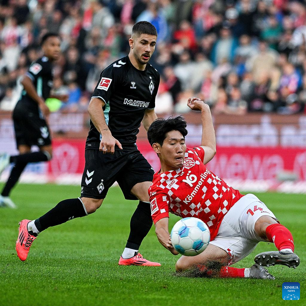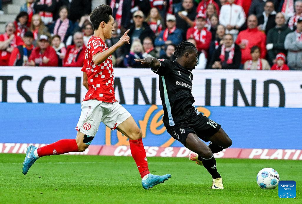 Hong Hyunseok (R) of Mainz 05 competes during the first division of Bundesliga football match between Mainz 05 and Werder Bremen in Mainz, Germany, Sept. 15, 2024. (Photo by Ulrich Hufnagel/Xinhua)