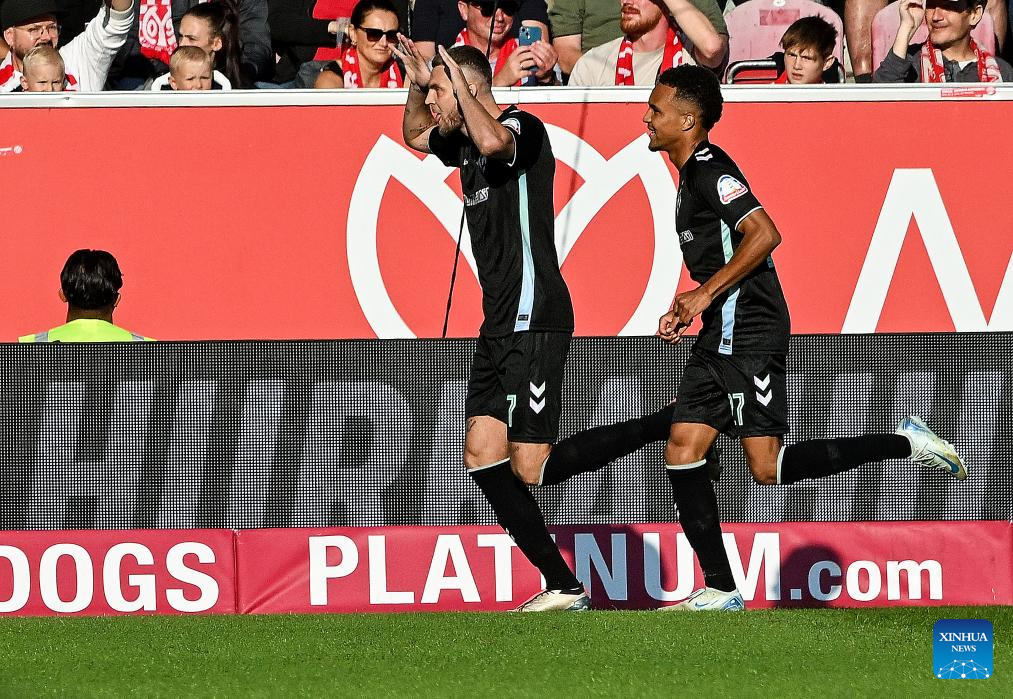 Marvin Ducksch (L) of Werder Bremen celebrates scoring during the first division of Bundesliga football match between Mainz 05 and Werder Bremen in Mainz, Germany, Sept. 15, 2024. (Photo by Ulrich Hufnagel/Xinhua)
