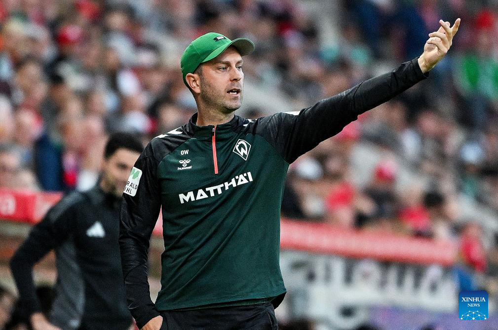 Ole Werner, head coach of Werder Bremen, instructs players during the first division of Bundesliga football match between Mainz 05 and Werder Bremen in Mainz, Germany, Sept. 15, 2024. (Photo by Ulrich Hufnagel/Xinhua)