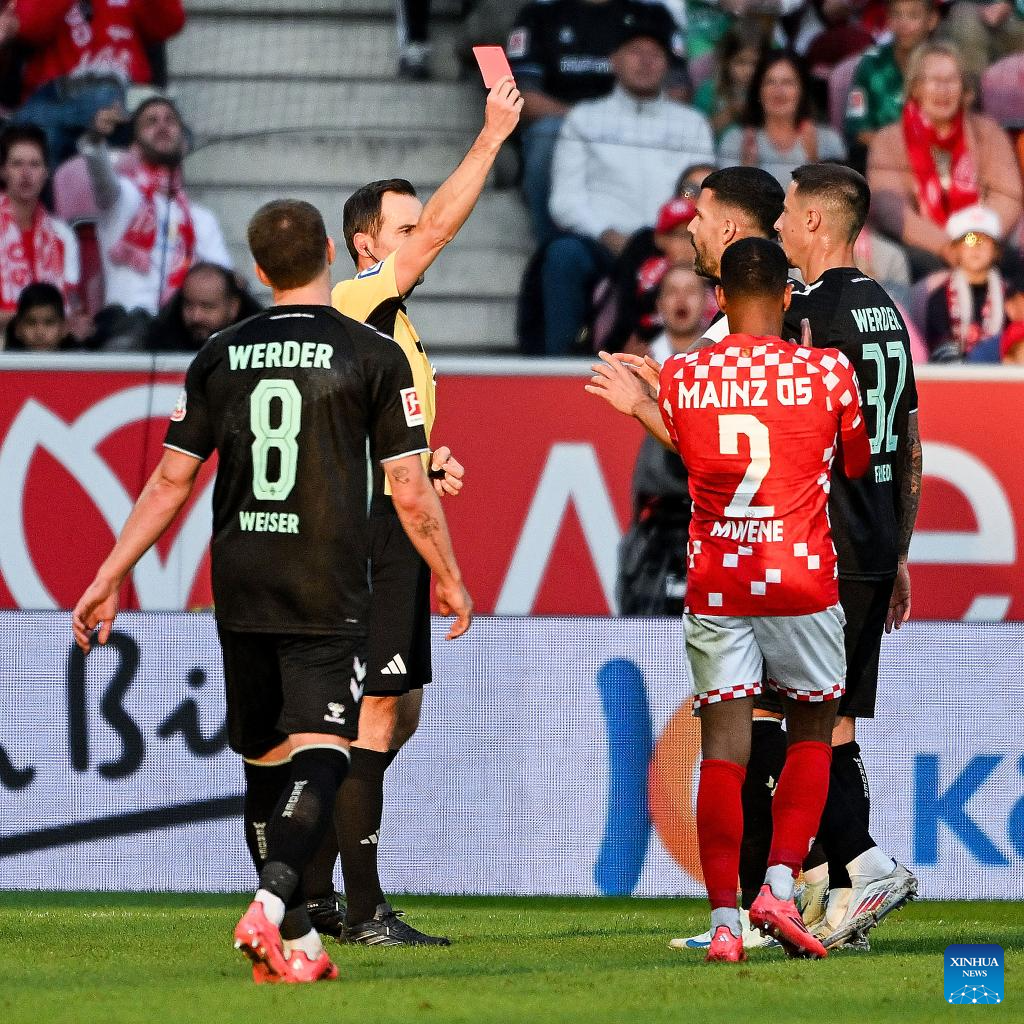 Marco Friedl (1st R) of Werder Bremen gets a red card during the first division of Bundesliga football match between Mainz 05 and Werder Bremen in Mainz, Germany, Sept. 15, 2024. (Photo by Ulrich Hufnagel/Xinhua)