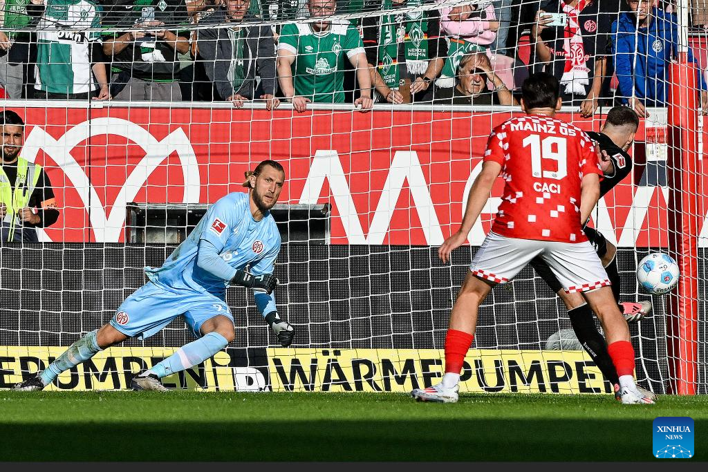 Derrick Arthur Kohn (R) of Werder Bremen shoots to score during the first division of Bundesliga football match between Mainz 05 and Werder Bremen in Mainz, Germany, Sept. 15, 2024. (Photo by Ulrich Hufnagel/Xinhua)
