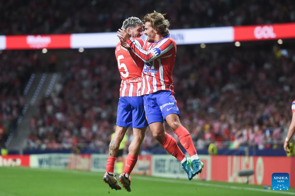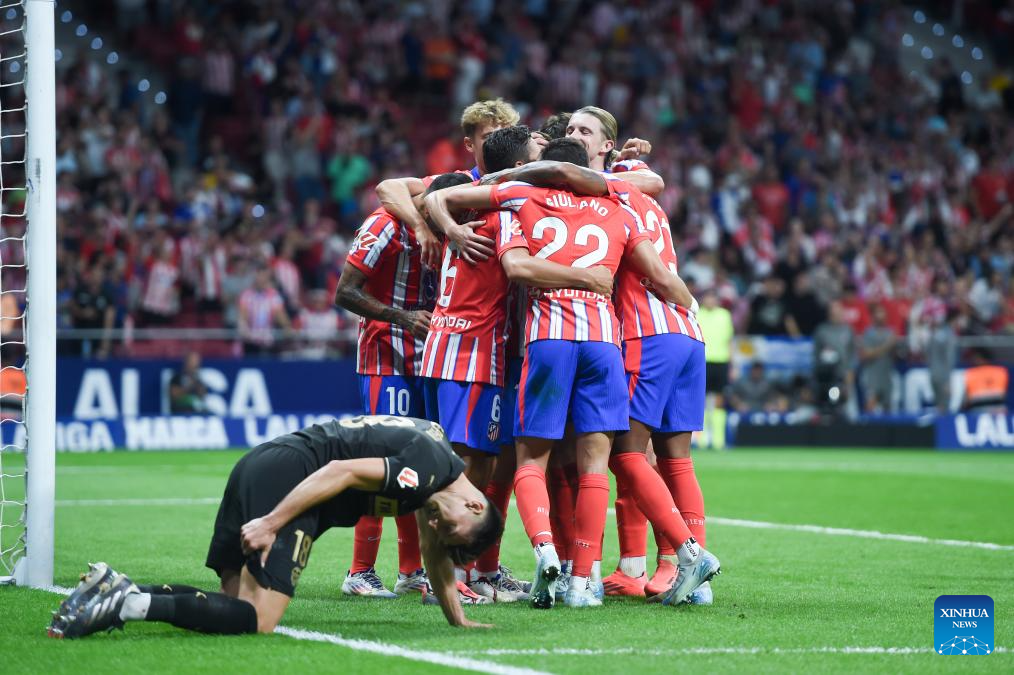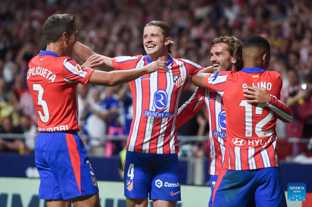 Atletico's players celebrate a goal during the Spanish league (La Liga) football match between Atletico de Madrid and Valencia CF in Madrid, Spain, on Sept. 15, 2024. (Photo by Gustavo Valiente/Xinhua)