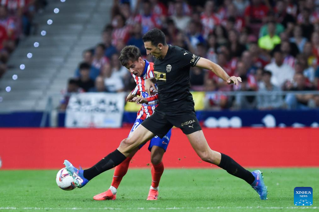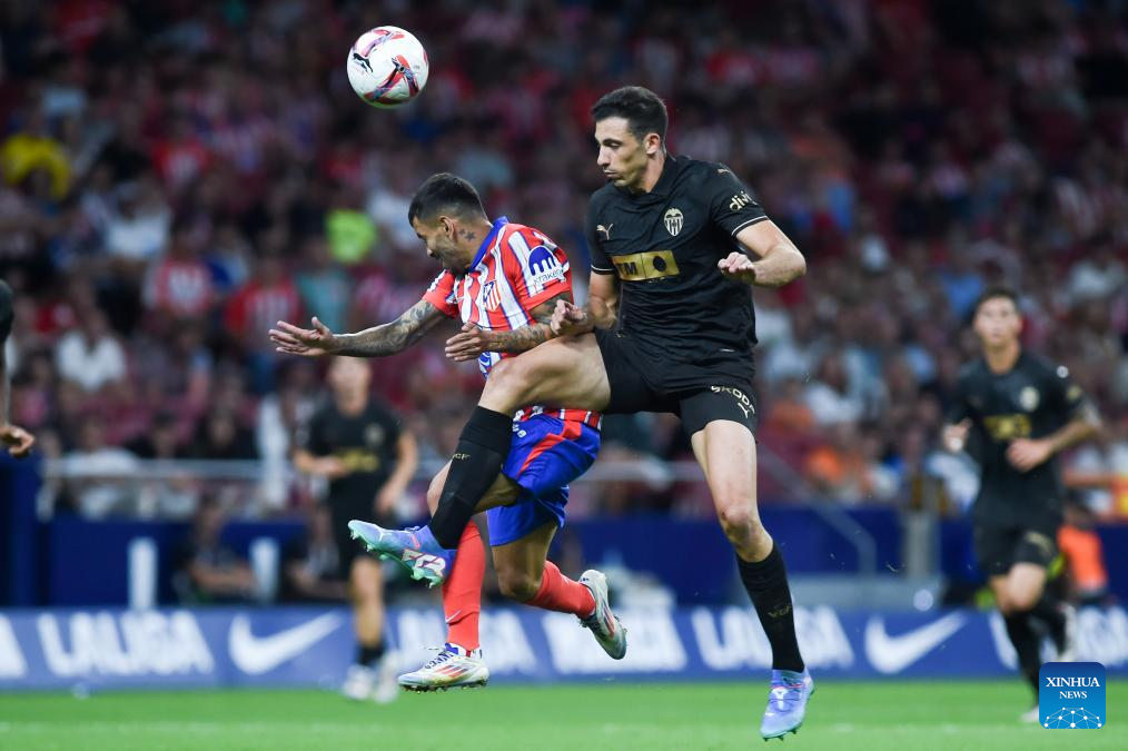 Atletico's Angel Correa (L) vies with Valencia's Cesar Tarrega during the Spanish league (La Liga) football match between Atletico de Madrid and Valencia CF in Madrid, Spain, on Sept. 15, 2024. (Photo by Gustavo Valiente/Xinhua)