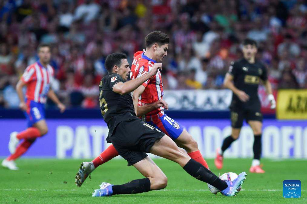 Atletico's Julian Alvarez competes during the Spanish league (La Liga) football match between Atletico de Madrid and Valencia CF in Madrid, Spain, on Sept. 15, 2024. (Photo by Gustavo Valiente/Xinhua)