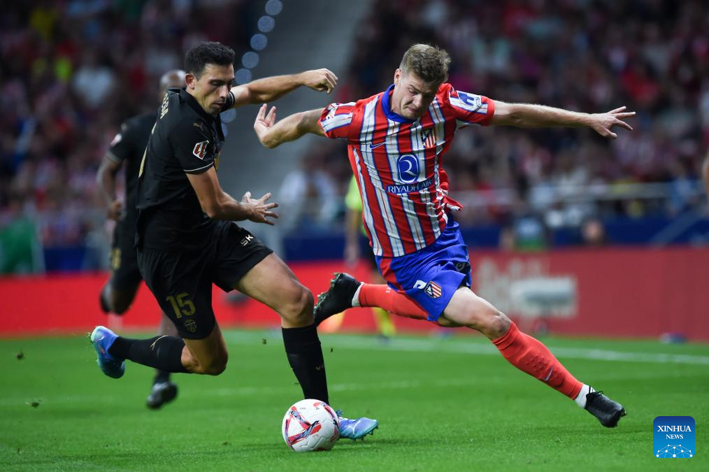 Atletico's Alexander Sorloth (R) vies with Valencia's Cesar Tarrega during the Spanish league (La Liga) football match between Atletico de Madrid and Valencia CF in Madrid, Spain, on Sept. 15, 2024. (Photo by Gustavo Valiente/Xinhua)