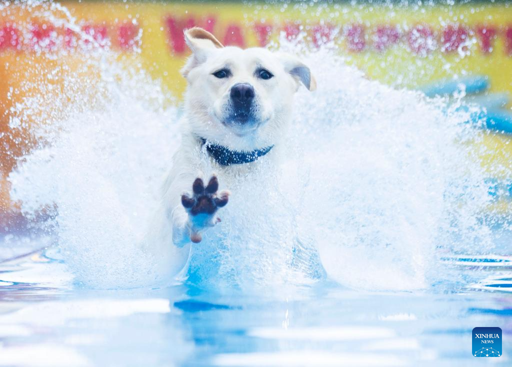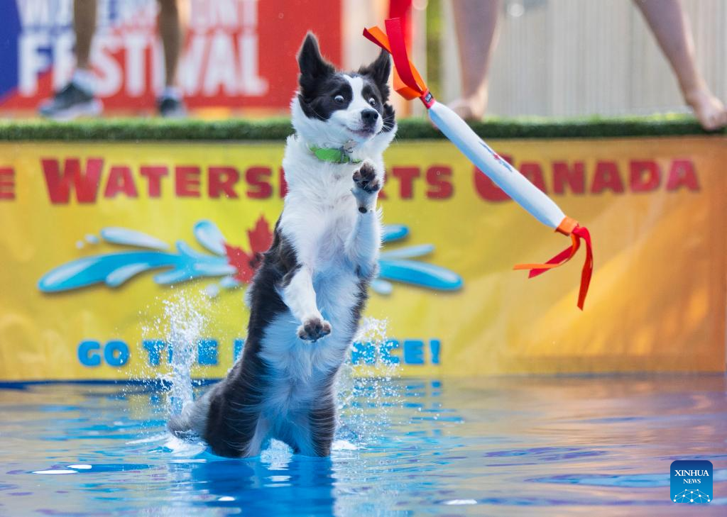 A pet dog jumps into a pool to catch a tossed toy during a dock diving event at the 2024 Waterfront Festival in Toronto, Canada, Sept. 15, 2024. Dock diving is a sport where agile dogs compete for prizes by jumping for distance from a dock into a pool of water. (Photo by Zou Zheng/Xinhua)