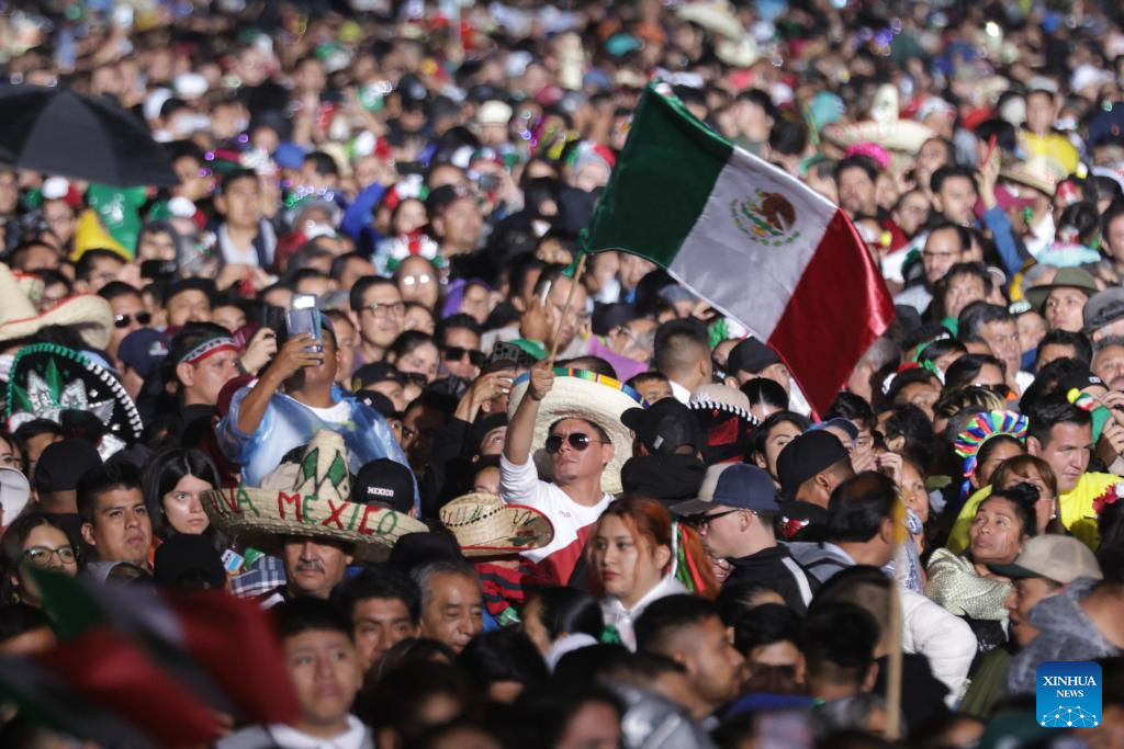 People attend the "Cry of Dolores" ceremony to commemorate the 214th anniversary of its struggle for independence from Spanish colonial rule at the Zocalo Square in Mexico City, Mexico, Sept. 15, 2024. (Photo by Francisco Canedo/Xinhua)