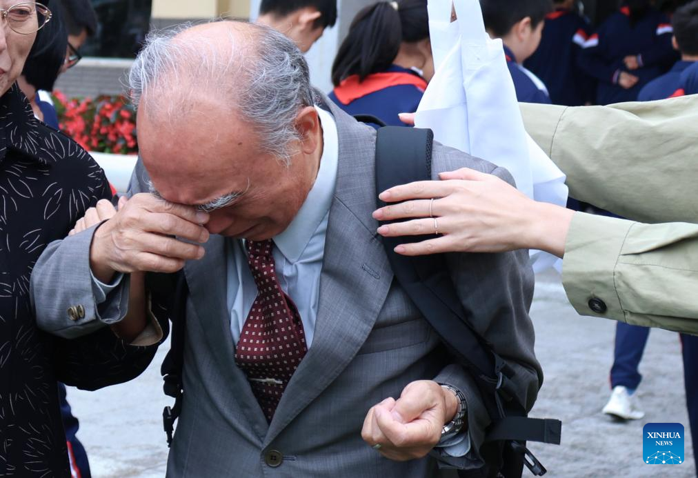 Kuroi Akio, descendant of WWII Japanese invader Kuroi Keijirou, cries after attending an apology ceremony in Gongzhuling, northeast China's Jilin Province, Sept. 14, 2024. (Photo by Tang Mingze/Xinhua)