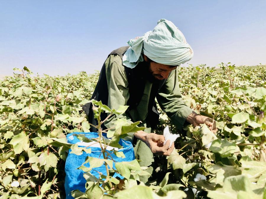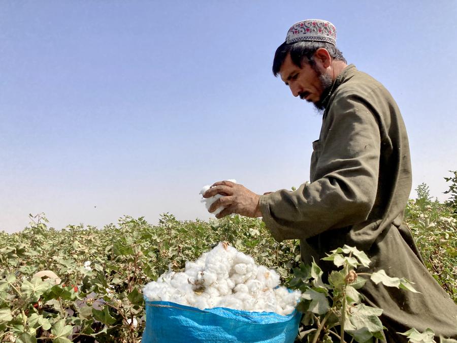 A farmer collects cotton in a cotton field in Kandahar province, Afghanistan, Sept. 14, 2024. (Photo by Arghand/Xinhua)