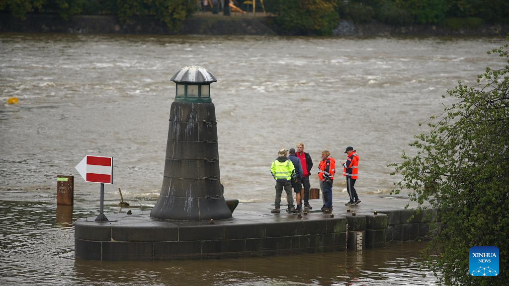 Members of flood commission monitor the state of the Vltava River in Prague, the Czech Republic, on Sept. 16, 2024. At least three people were dead and seven others went missing due to floods caused by extreme rainfall in the Czech Republic, police said on Monday. (Photo by Dana Kesnerova/Xinhua)
