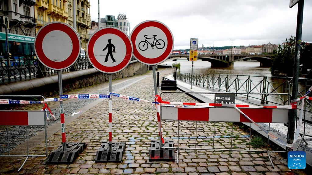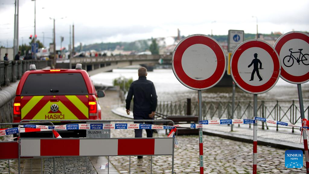 A road is closed due to floods along the Vltava River in Prague, the Czech Republic, on Sept. 16, 2024. At least three people were dead and seven others went missing due to floods caused by extreme rainfall in the Czech Republic, police said on Monday. (Photo by Dana Kesnerova/Xinhua)