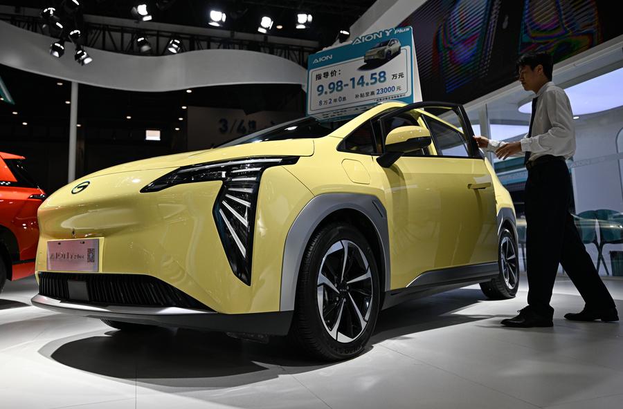 A GAC Aion Y Plus car is seen at the 2024 Hainan Autumn Auto Show in Hainan International Conference and Exhibition Center in Haikou, capital of south China's Hainan Province, Sept. 16, 2024.(Xinhua/Pu Xiaoxu)