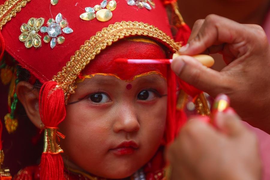 A girl dressed up as living goddess prepares for the celebration of the traditional Kumari Puja in Kathmandu, Nepal, Sept. 16, 2024. (Photo by Sulav Shrestha/Xinhua)A girl dressed up as living goddess is pictured during the celebration of the traditional Kumari Puja in Kathmandu, Nepal, Sept. 16, 2024. (Photo by Sulav Shrestha/Xinhua)A girl dressed up as living goddess is pictured during the celebration of the traditional Kumari Puja in Kathmandu, Nepal, Sept. 16, 2024. (Photo by Sulav Shrestha/Xinhua)■