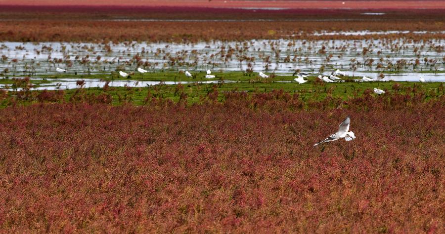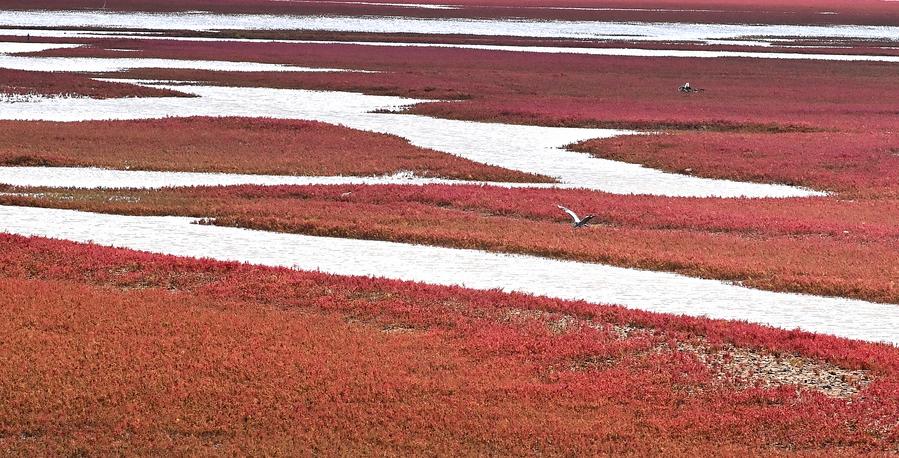 Birds are pictured at the Red Beach scenic area in Linghai, Jinzhou City, northeast China's Liaoning Province, Sept. 14, 2024. (Xinhua/Qian Yi)
