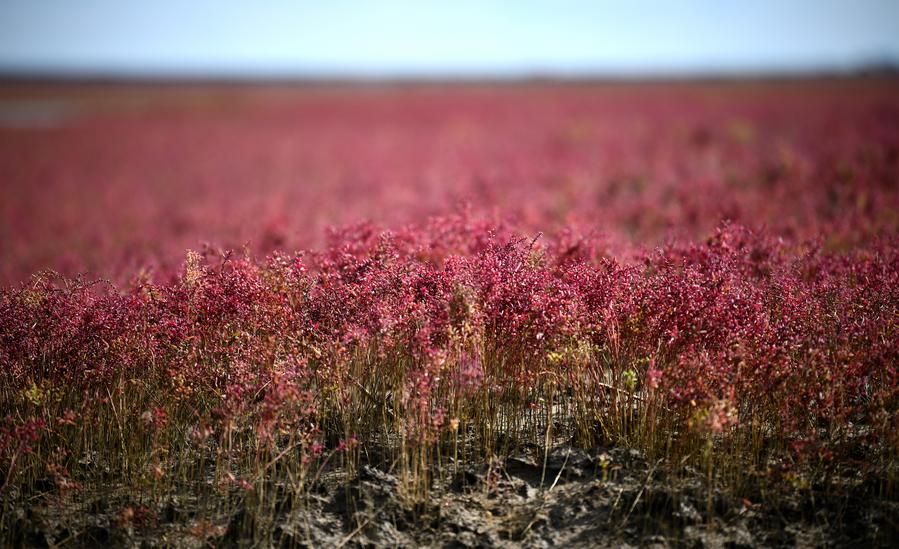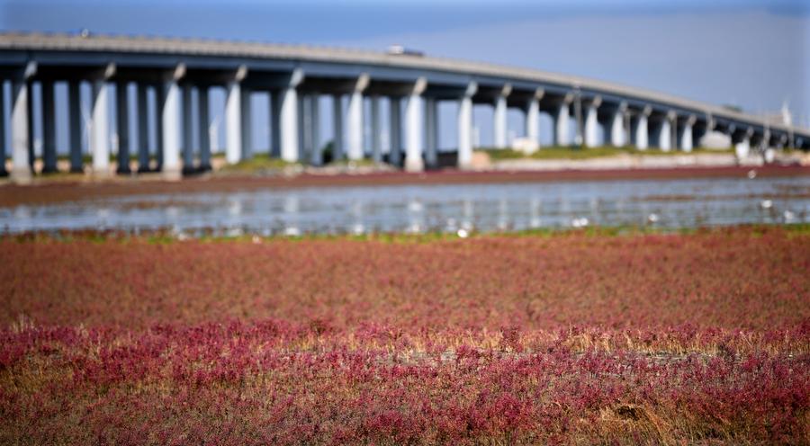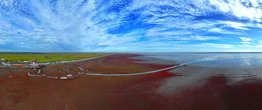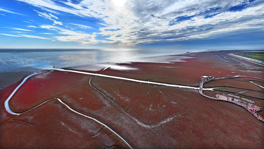SHENYANG, Sept. 18 (Xinhua) -- Located in northeast China's Liaoning Province, the Red Beach, which is famous for its landscapes featuring the red plant of Suaeda salsa, welcomes tourists with a spectacular view.