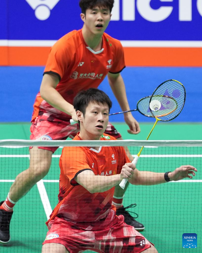 Ren Xiangyu (front)/He Jiting of China compete during the men's doubles round of 32 match against Peeratchai Sukphun/Pakkapon Teeraratsakul of Thailand at the China Open 2024 badminton tournament in Changzhou, east China's Jiangsu Province, Sept. 18, 2024. (Xinhua/Yang Lei)