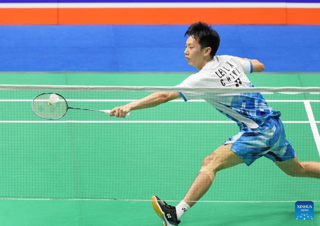 Lei Lanxi of China hits a return during the men's singles round of 32 match against Viktor Axelsen of Denmark at the China Open 2024 badminton tournament in Changzhou, east China's Jiangsu Province, Sept. 18, 2024. (Xinhua/Yang Lei)