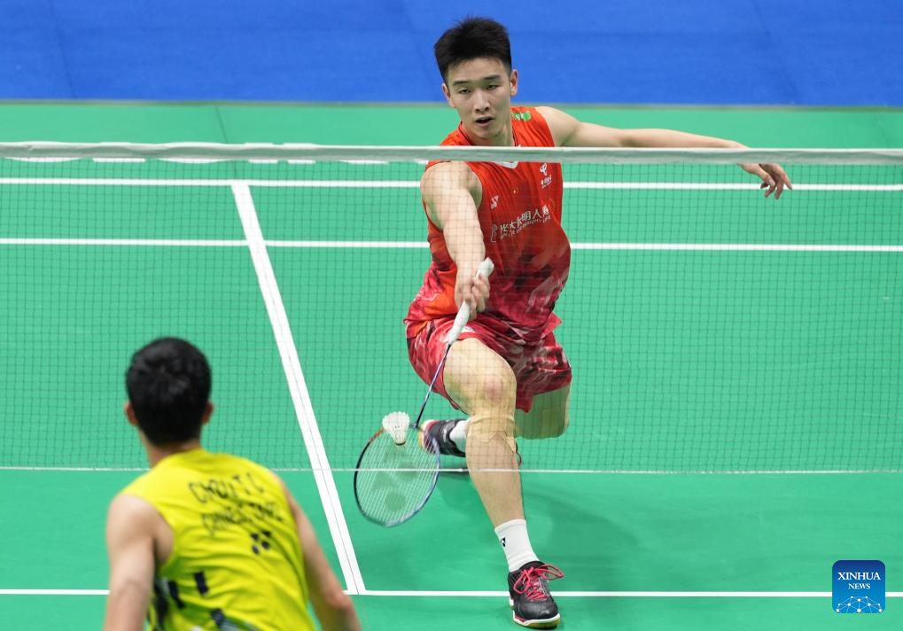 Li Shifeng (R) of China hits a return during the men's singles round of 32 match against Chou Tien-Chen of Chinese Taipei at the China Open 2024 badminton tournament in Changzhou, east China's Jiangsu Province, Sept. 18, 2024. (Xinhua/Yang Lei)