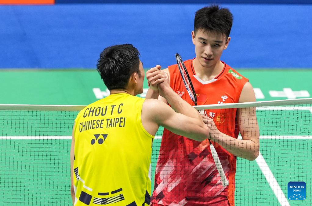 Chou Tien-Chen (L) of Chinese Taipei greets Li Shifeng of China after their men's singles round of 32 match at the China Open 2024 badminton tournament in Changzhou, east China's Jiangsu Province, Sept. 18, 2024. (Xinhua/Yang Lei)