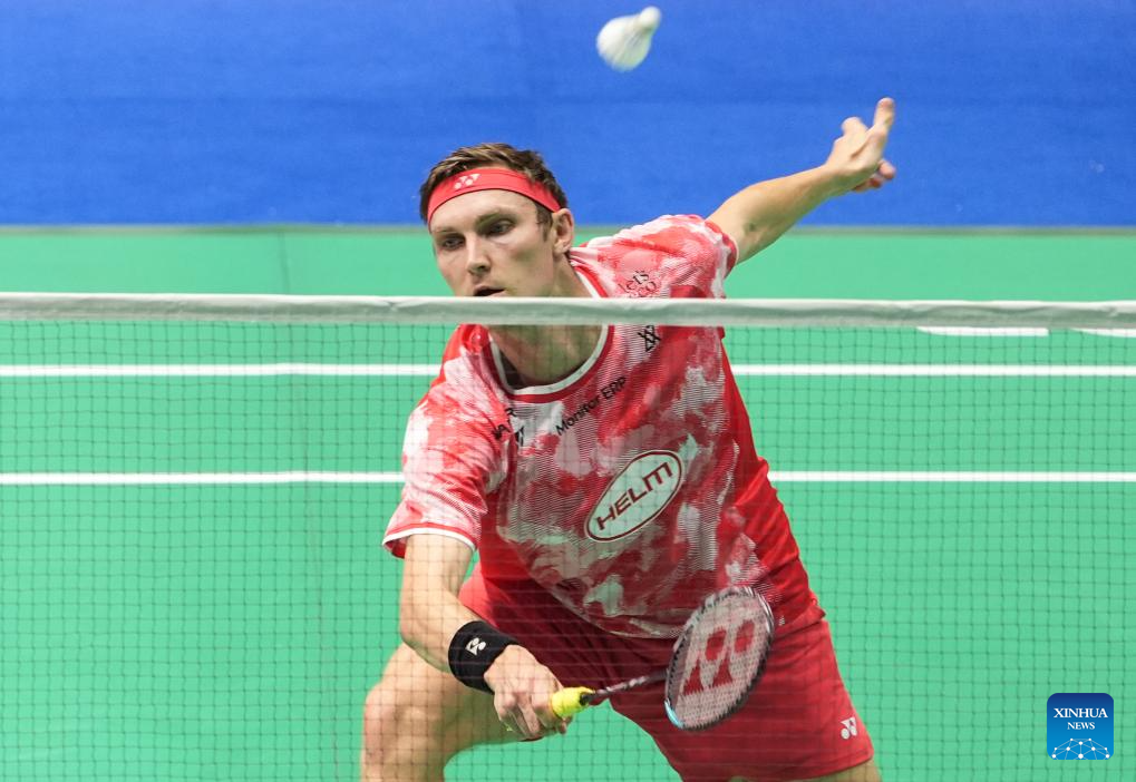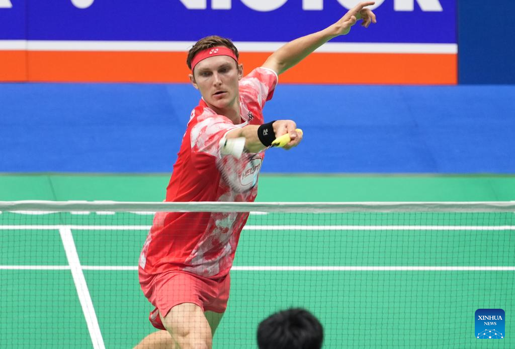 Viktor Axelsen of Denmark hits a return during the men's singles round of 32 match against Lei Lanxi of China at the China Open 2024 badminton tournament in Changzhou, east China's Jiangsu Province, Sept. 18, 2024. (Xinhua/Yang Lei)