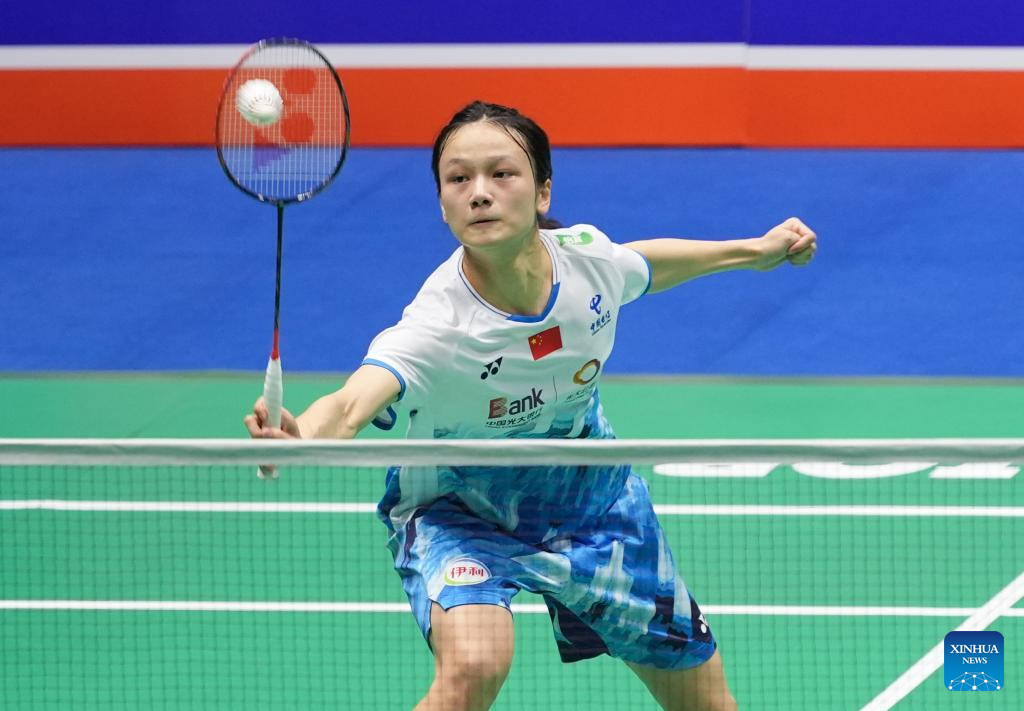 Zhang Yiman of China hits a return during the women's singles round of 32 match against Lauren Lam of the United States at the China Open 2024 badminton tournament in Changzhou, east China's Jiangsu Province, Sept. 18, 2024. (Xinhua/Yang Lei)