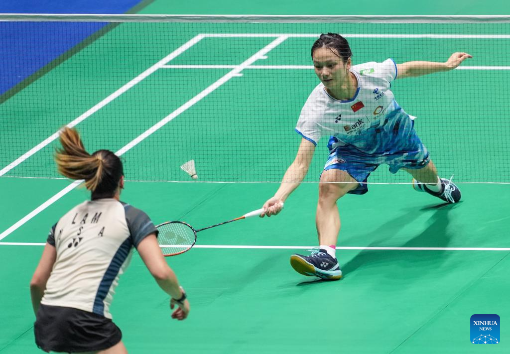 Zhang Yiman (R) of China hits a return during the women's singles round of 32 match against Lauren Lam of the United States at the China Open 2024 badminton tournament in Changzhou, east China's Jiangsu Province, Sept. 18, 2024. (Xinhua/Yang Lei)