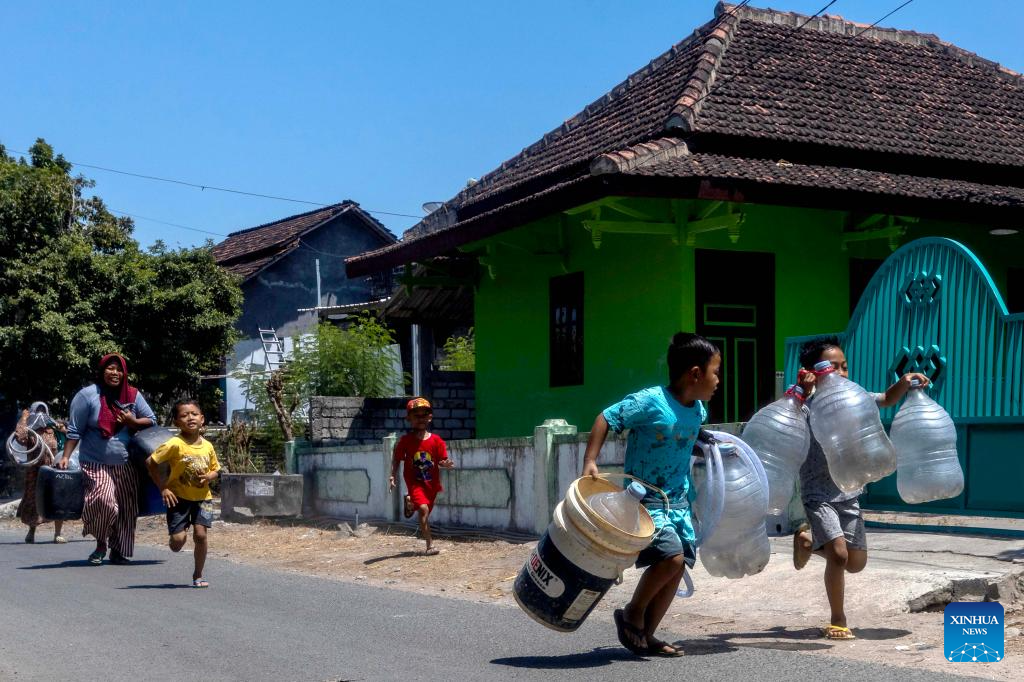 Children run to collect clean water from a water storage barrel distributed by Indonesian Red Cross (PMI) Rembang regional office due to the drought season in Rembang regency, Central Java, Indonesia, Sept. 18, 2024. (Photo by Sigit Pamungkas/Xinhua)