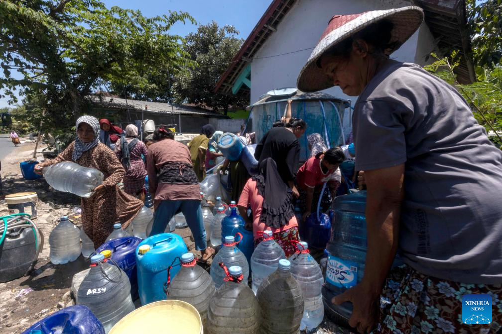 People collect clean water from a water storage barrel distributed by Indonesian Red Cross (PMI) Rembang regional office due to the drought season in Rembang regency, Central Java, Indonesia, Sept. 18, 2024. (Photo by Sigit Pamungkas/Xinhua)