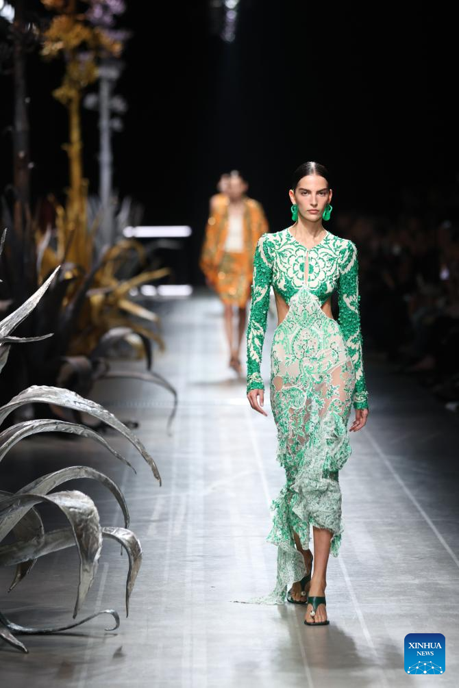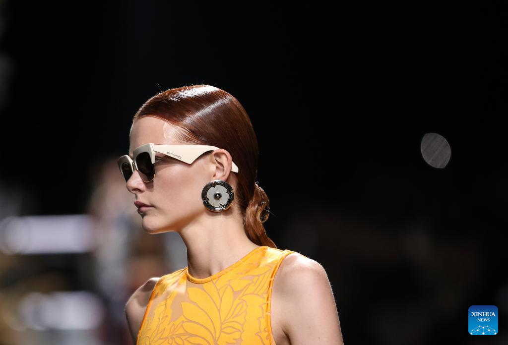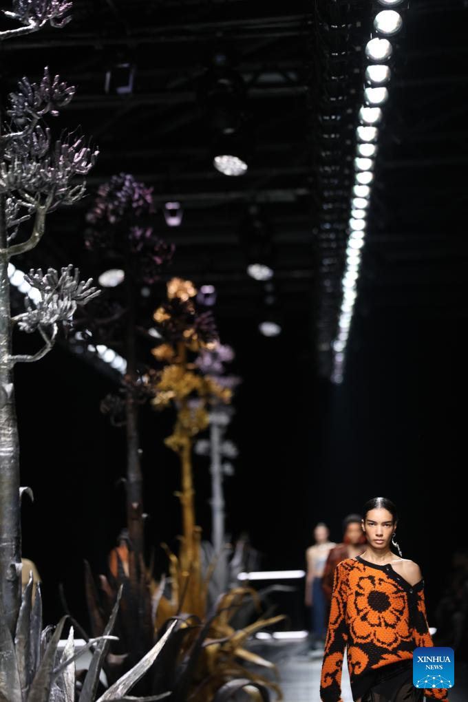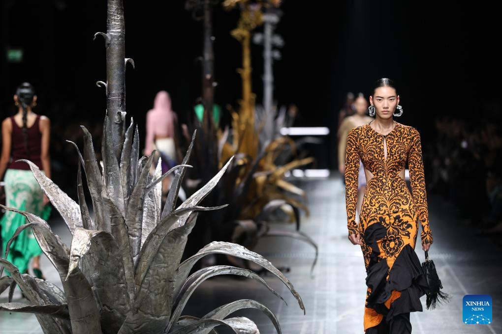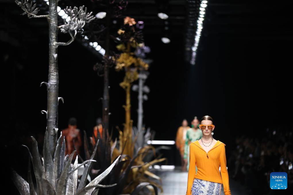 A model presents creations of Etro Women's wear Spring/Summer 2025 collections during Milan Fashion Week in Milan, Italy, Sept. 18, 2024. (Xinhua/Li Jing)
